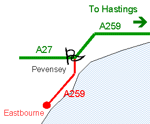 Pevensey castle lies between Hastings and Eastbourne, 1/2 mile from the junction of the A27 and the A259.