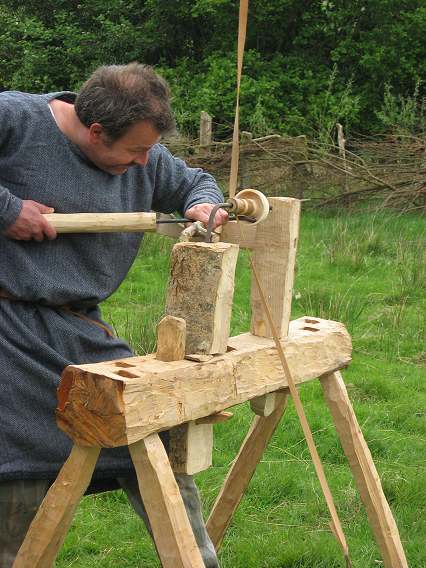 | The lathe uses a springy pole to provide the motive power. Press down on the treddle and the workpiece spins. Release and it spins back. You only cut on the down stroke so you have to get into a rhythm where your foot and hand movements are coordinated. | Evidence for the exact form of Anglo-Saxon lathes is very limited. Finds of turned items and waste from turning shows they used pole lathe but the only piece of a lathe found is a tool rest stand found at York. This is the notched piece sticking out under the turner's left arm. |