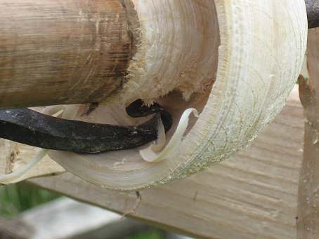 | It is vital that the tool is supported from the tool rest to get it to cut properly. Here a cranked tool is being used to cut the inside of a small bowl. | A close up of the cut shows the ribbon of waste coming away. |