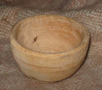 | The final product is a small applewood bowl or drinking cup. It needs to dry out for a few weeks before being finished with a coat of beeswax. |